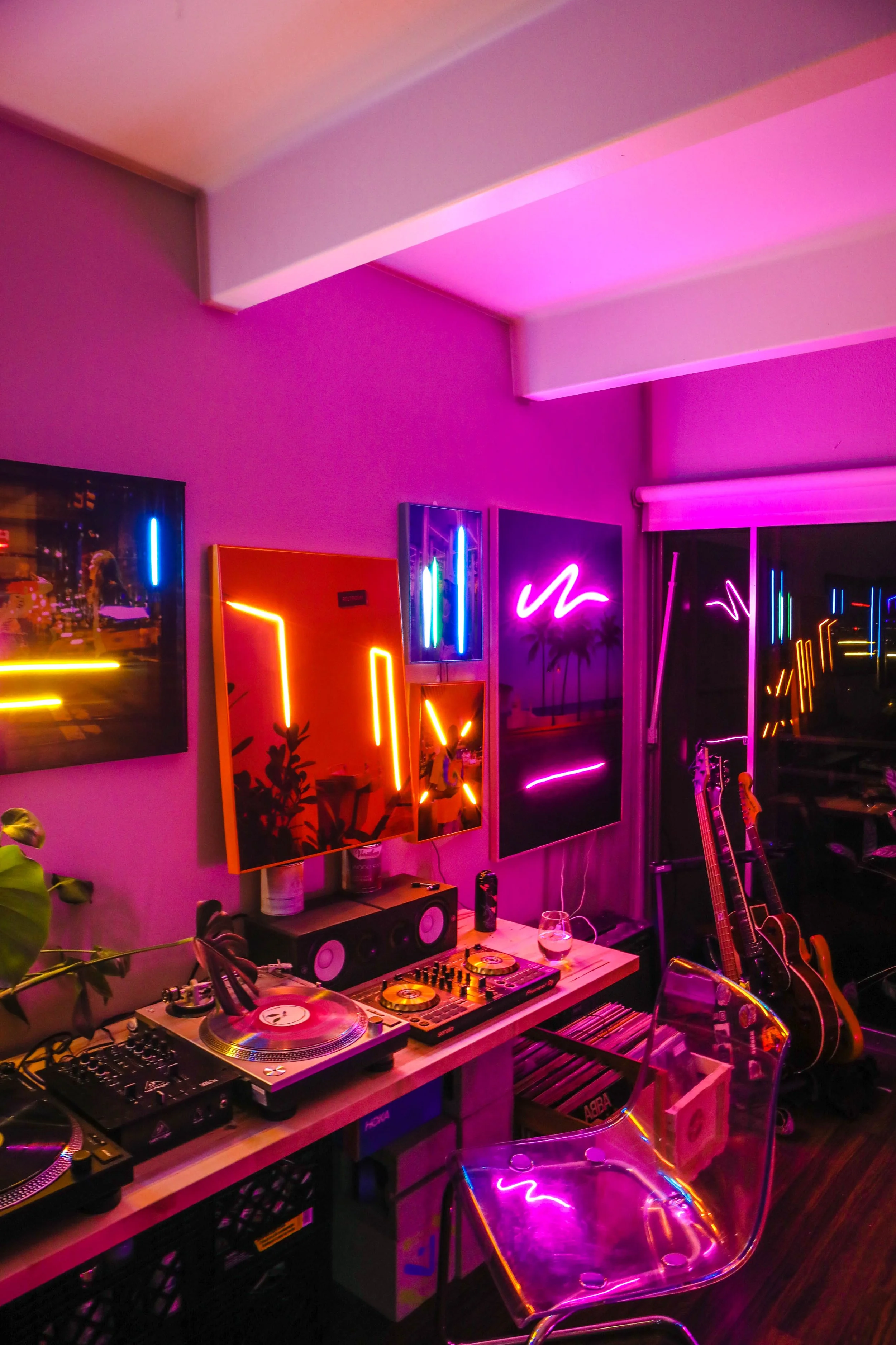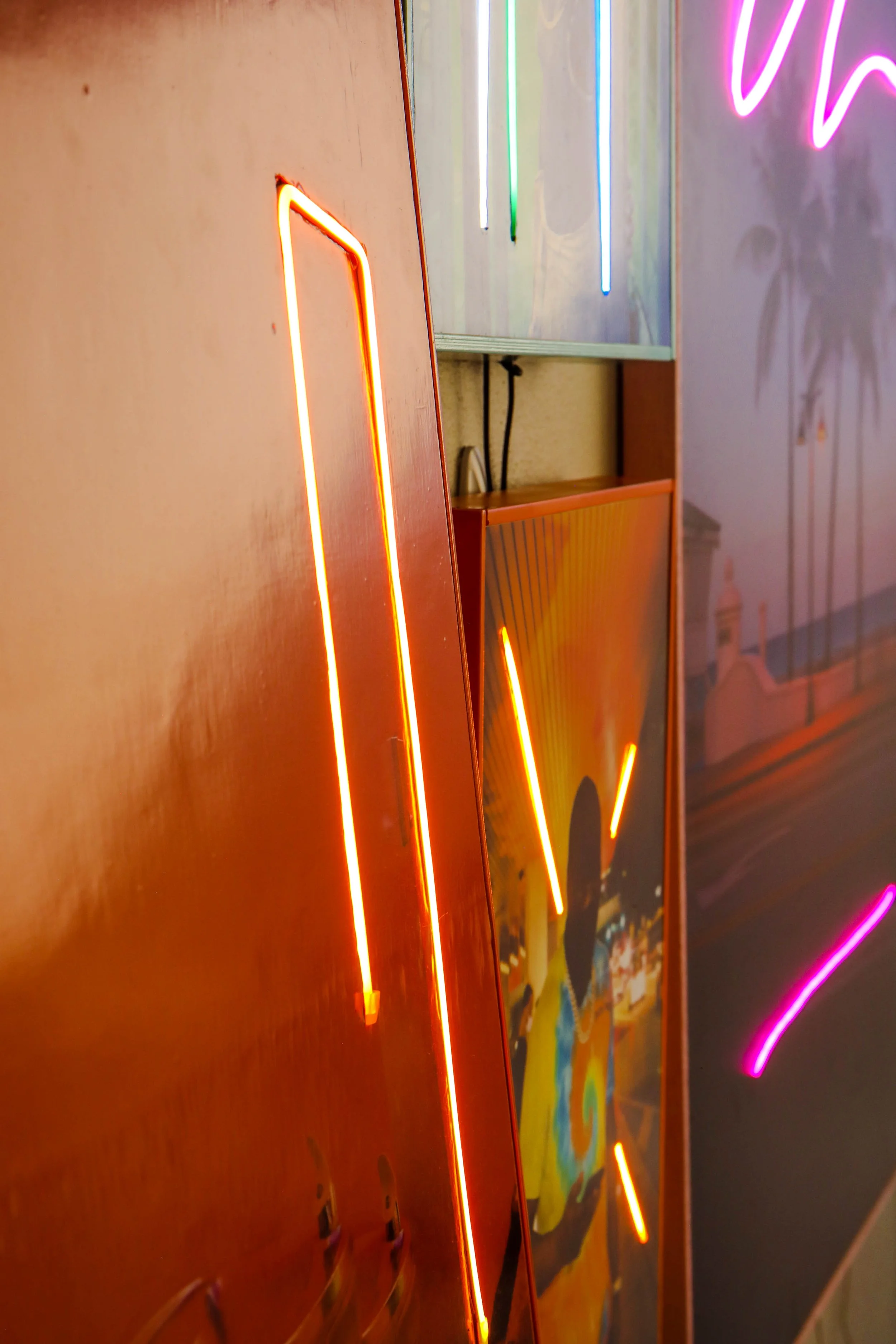 The added element of neon light elevates a gallery event into an experience of interactions; both between the light and the image, and between the pieces and the people in the space. As a whole this collection has a dual harmony not only in the subject matter, but through the playful glow of colored lines and shapes from the LED lights themselves. Individually, each moodscape can also stand alone with its subtle yet vibrant energy that lights up a room as a lamp would, bringing it closer to functionality than art.